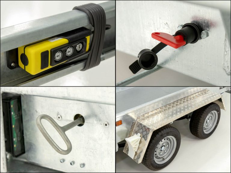 • Reboques porta-máquinas e basculantes de concepção profissional! Bomba elétrica com bateria, carregador integrado e controle remoto com fio
